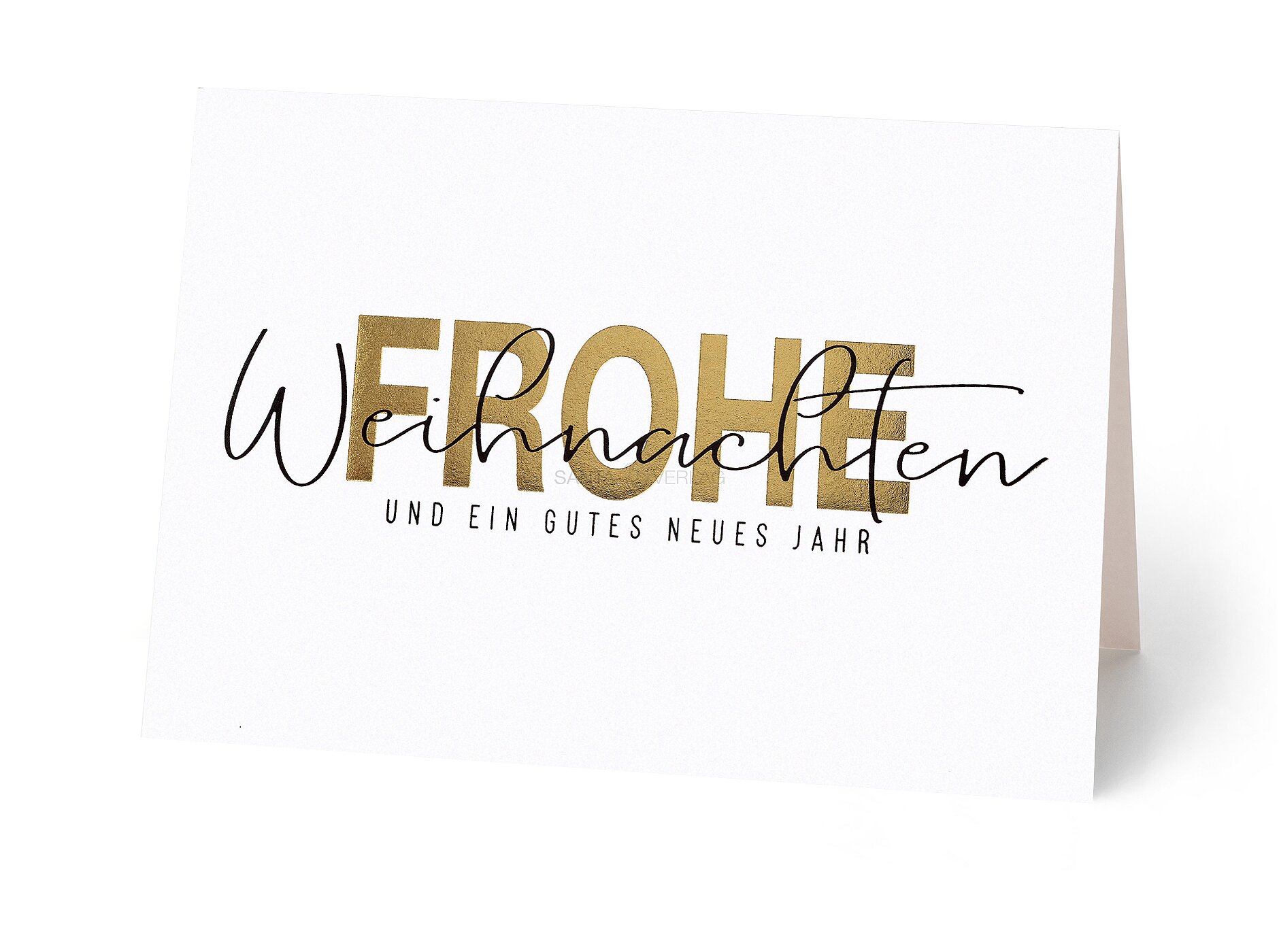 Die hochwertige Weihnachtskarte mit Goldfolie und der Aufschrift Frohe Weihnachten in Schwarz ist eine elegante und stilvolle Art, Weihnachtsgrüße zu übermitteln.