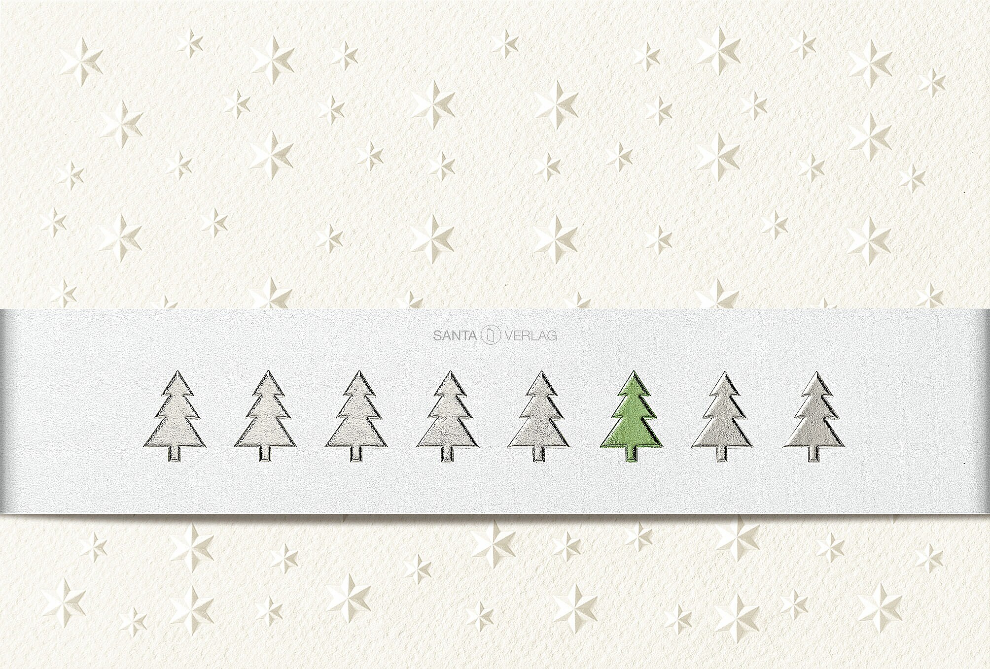 Weihnachtskarte auf cremefarbenem Karton "Sterne" verziert mit einer weißen Banderole durch Silber- und Grünfolienprägung veredelt.