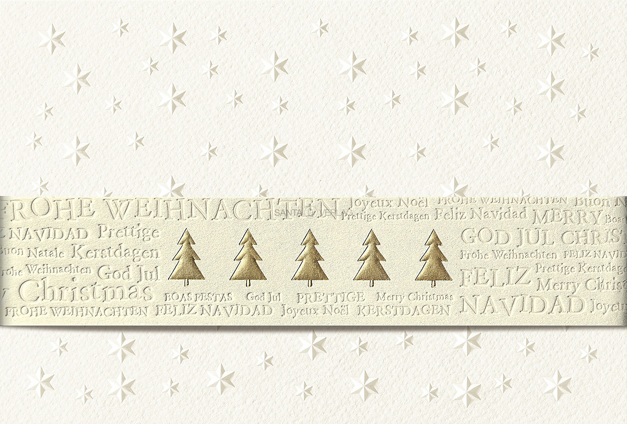 Weihnachtskarte auf cremefarbenem Karton "Sterne" verziert mit einer Text-Banderole in perlmutt durch Blind- und Goldfolienprägung veredelt.