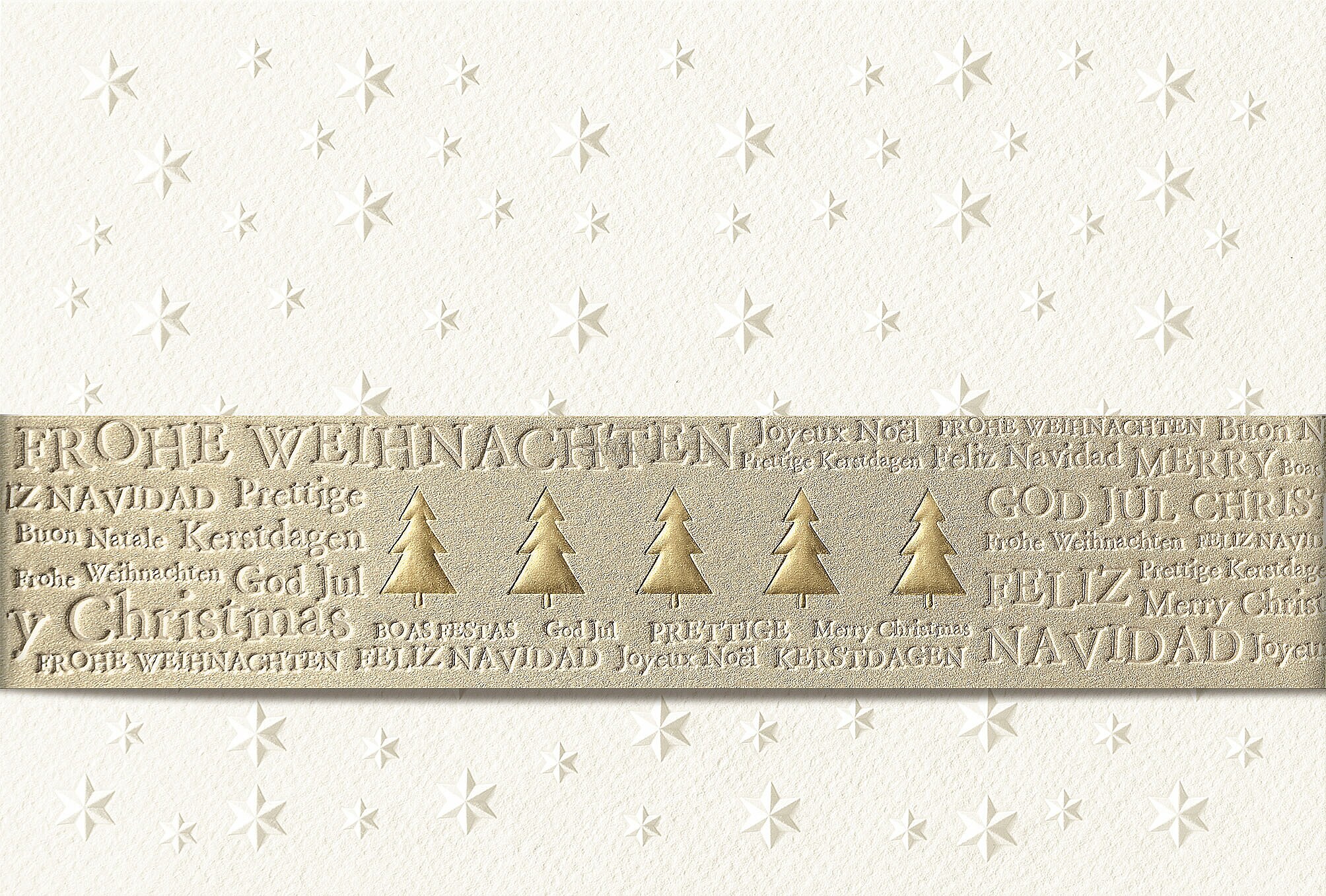 Weihnachtskarte auf cremefarbenem Karton "Sterne" verziert mit einer Text-Banderole in gold durch Blind- und Goldfolienprägung veredelt.