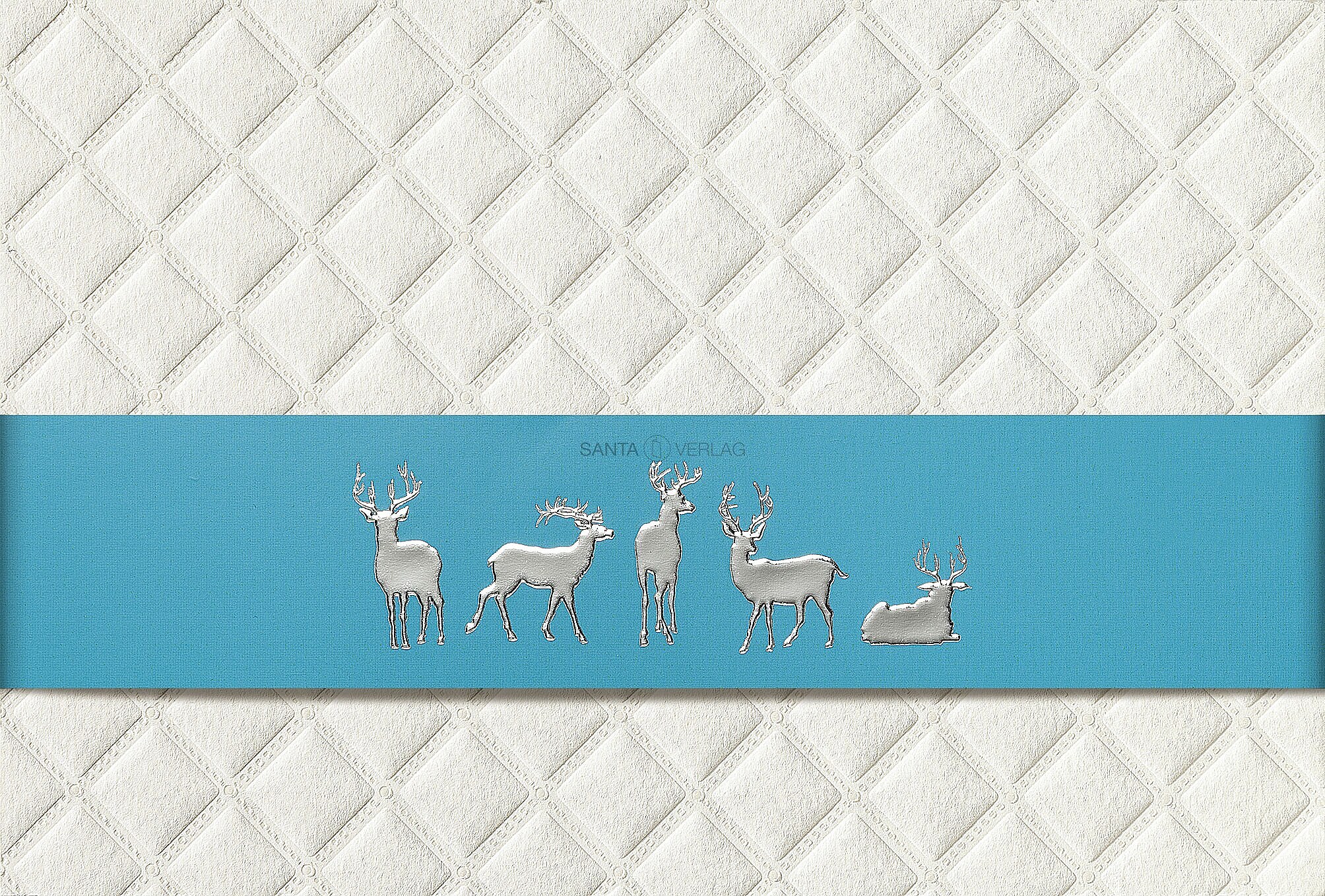 Weihnachtskarte auf weißem Karton "Raute" verziert mit einer Banderole " Elche" in türkis durch Silberfolienprägung veredelt.