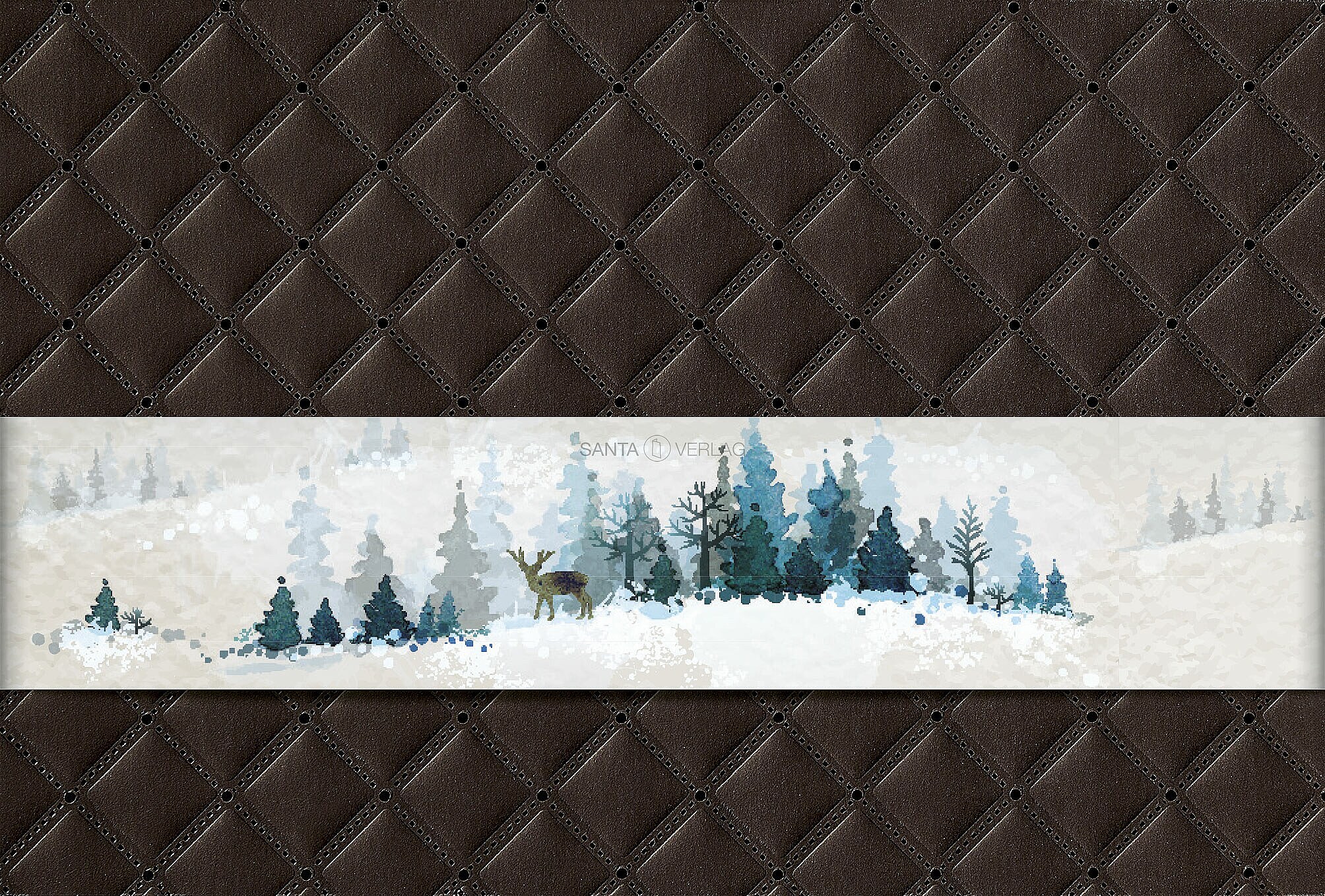 Weihnachtskarte auf dunkelbraunem Karton "Raute" verziert mit einer Banderole "Winterwald" gedruckt.
