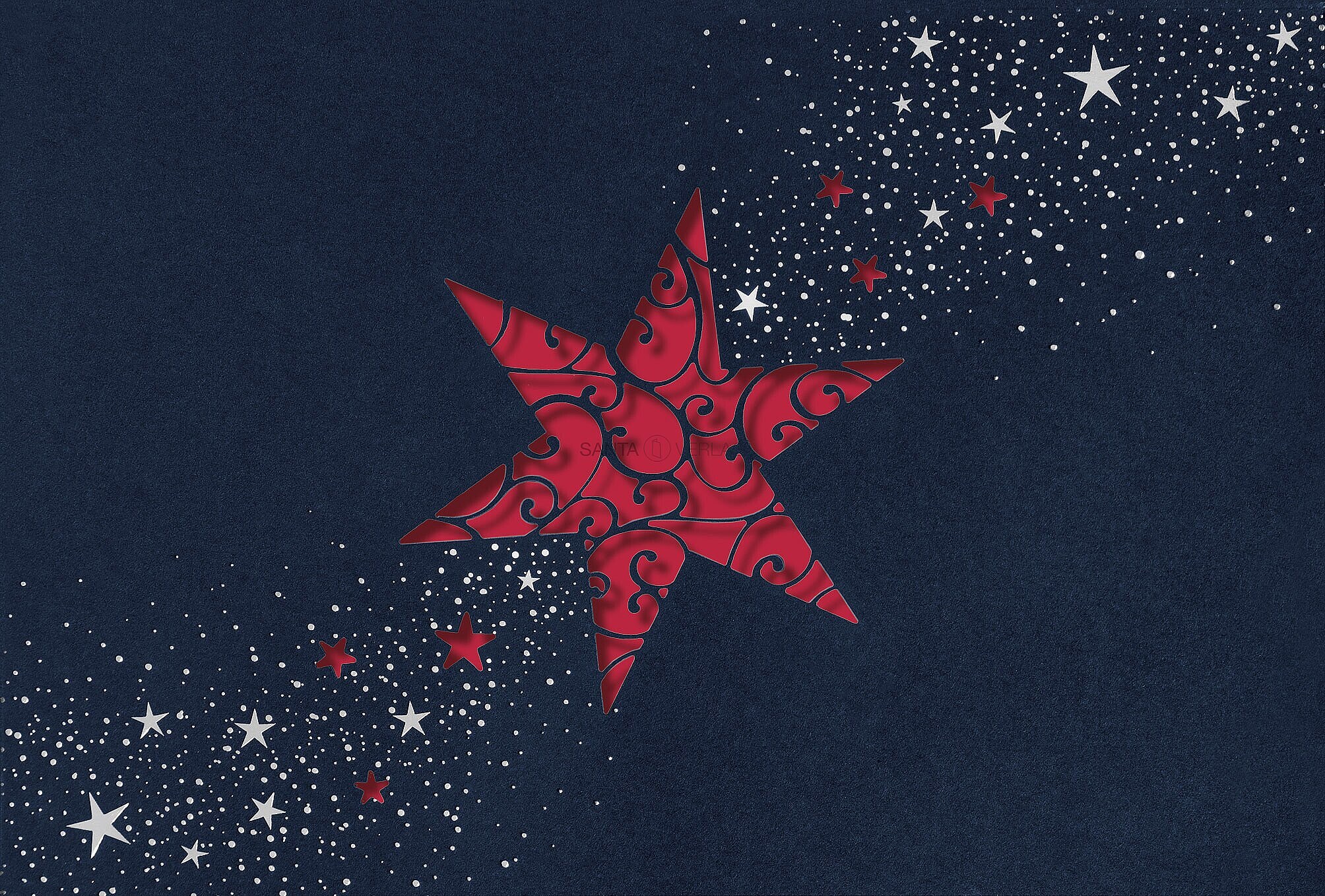 Weihnachtskarten mit filigranem Laserschnitt und Sternenschweif in Silberfolien-Prägung. Farbig hinterlegt.
