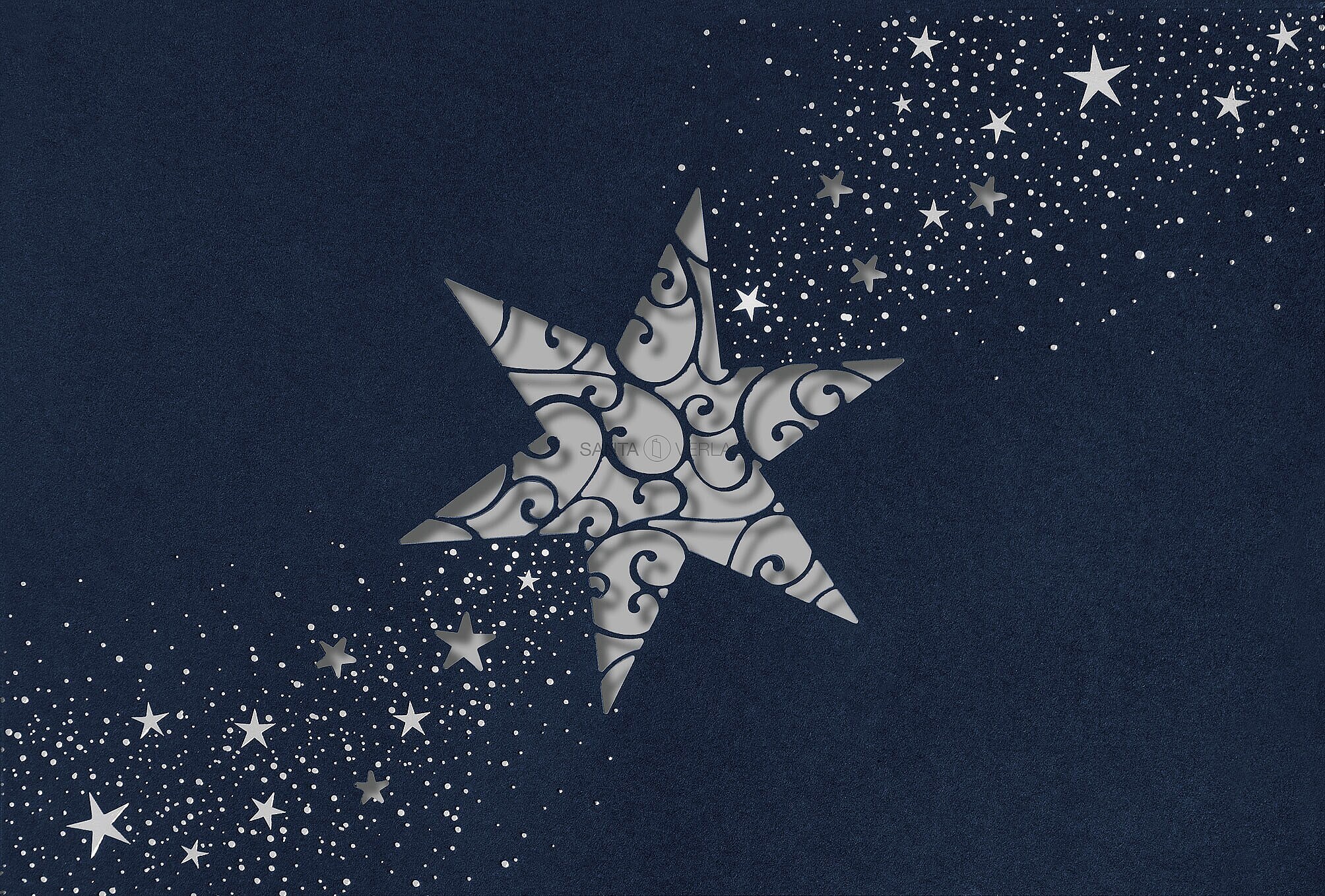 Weihnachtskarten mit filigranem Laserschnitt und Sternenschweif in Silberfolien-Prägung. Farbig hinterlegt.