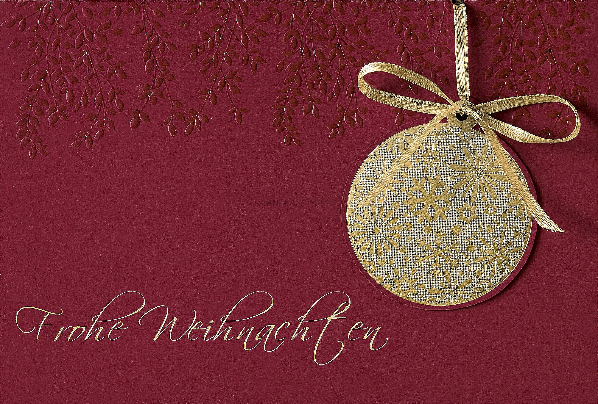 Weihnachtskarten bordeaux. Das Highlight dieser Karte ist die aufgepatchte Goldkugel, gehalten durch eine goldenen Schleife. Durch filigrane Goldschrift und feinen Blätterlack veredelt.