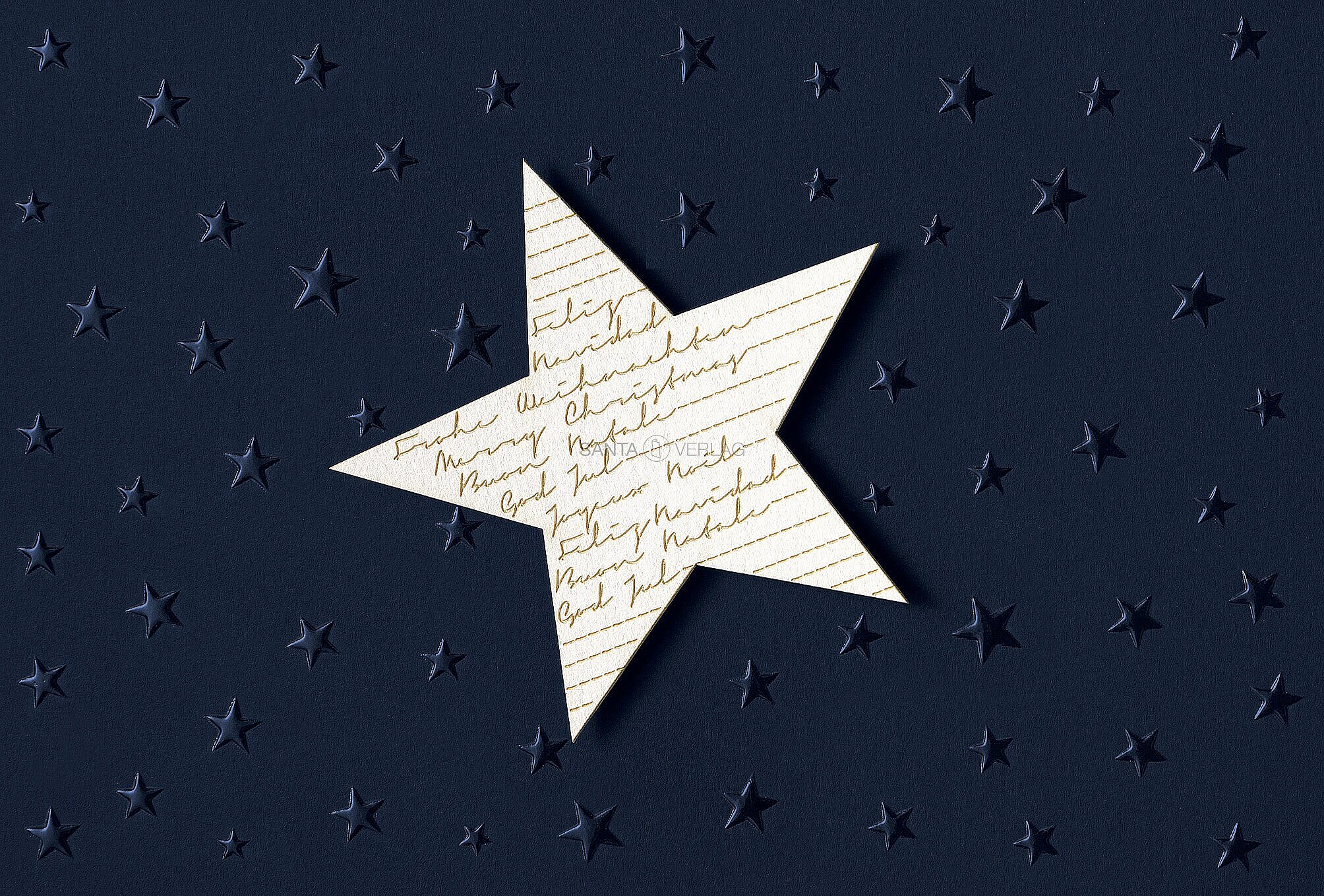 Weihnachtskarten "Stern" international auf dunkelblauem Feinkarton. Stern in Lasertechnik, wird aufgepatcht.