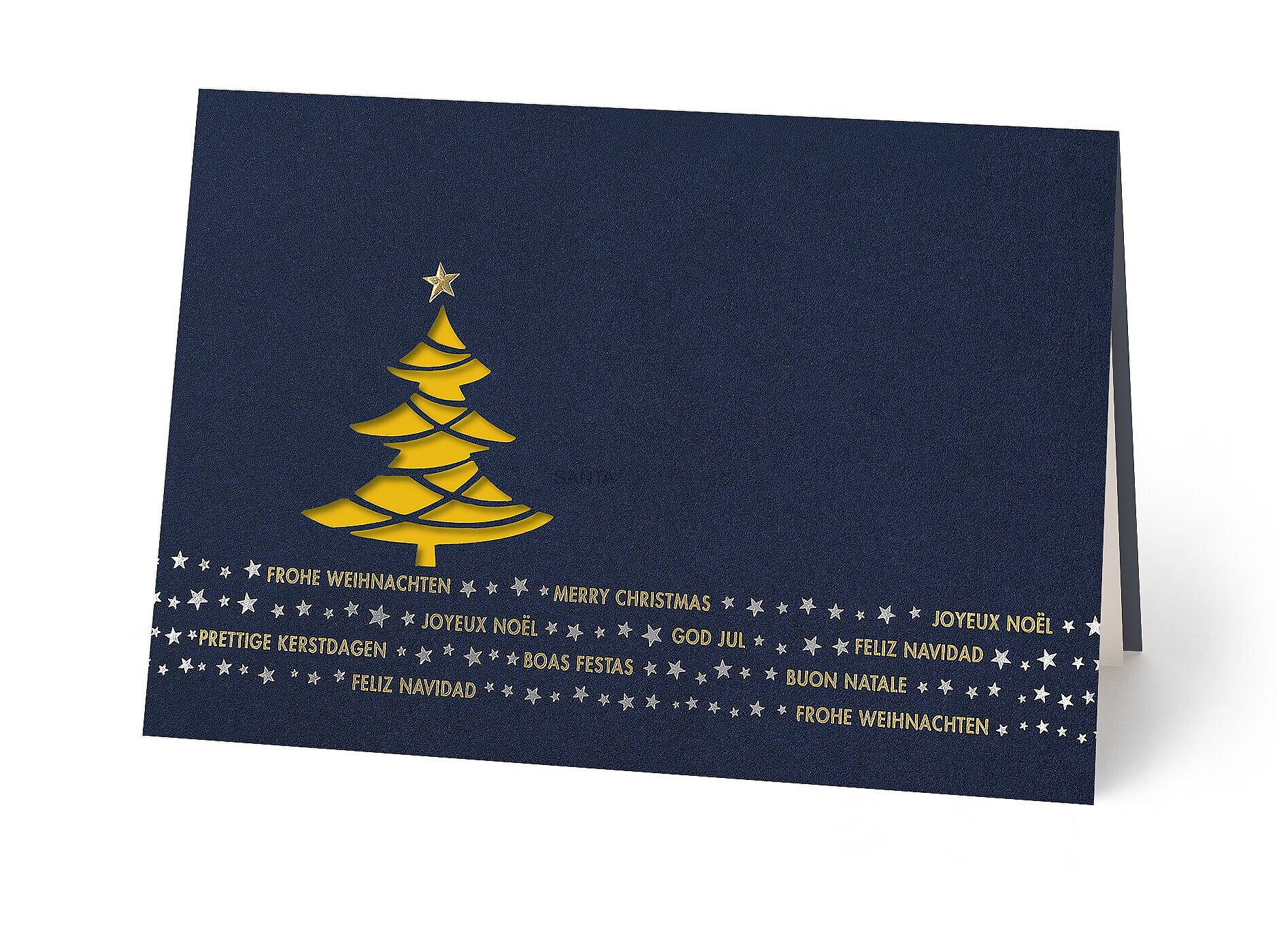 Weihnachtskarten international auf dunkelblauem Feinstkarton. Die verspielte Laserstanzung kommt durch das farbige Einlegeblatt besonders stilvoll zur Geltung.