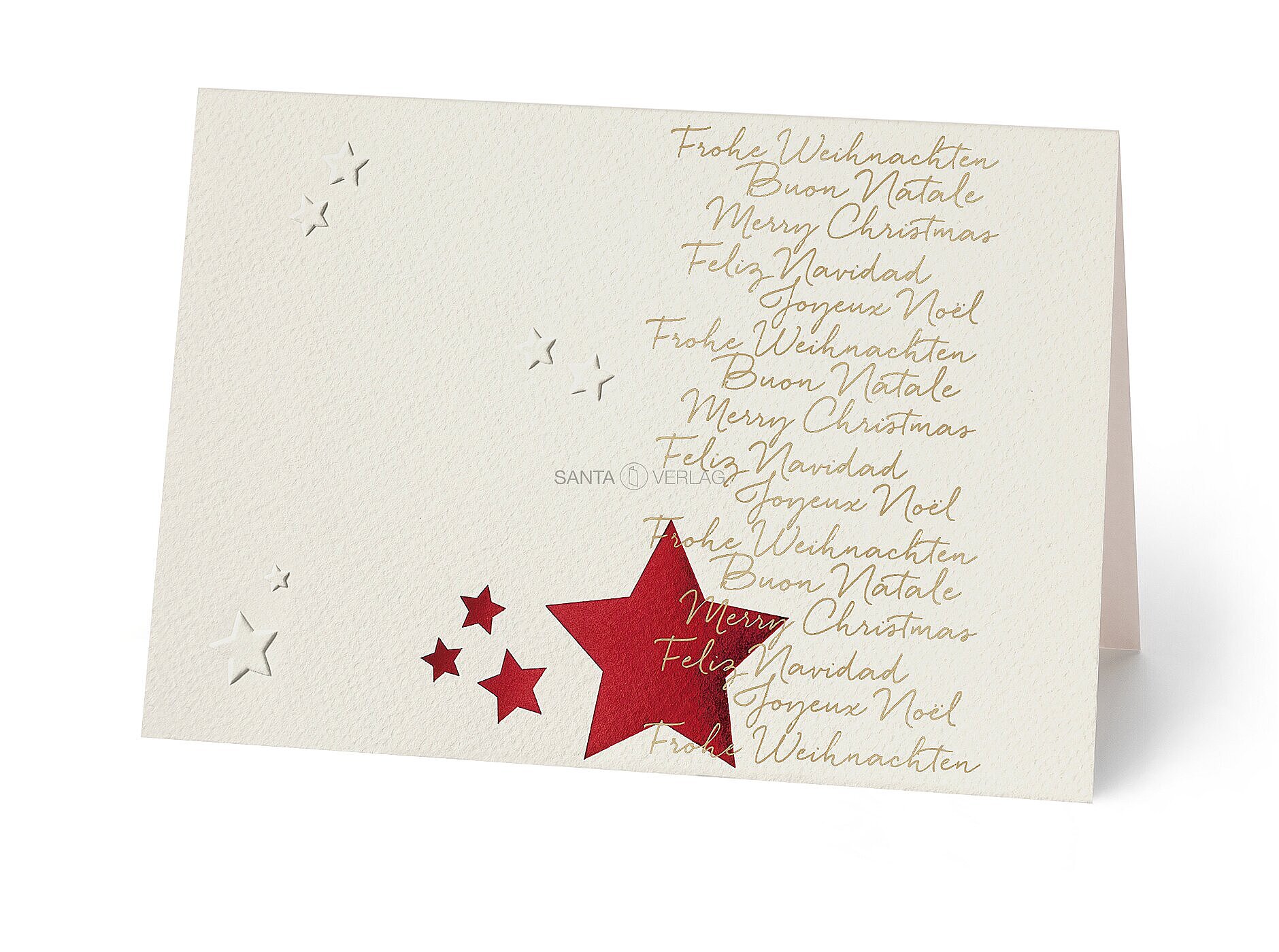 Weihnachtskarten international auf hellem Strukturkarton durch Gold- und Rotfolienprägung veredelt.