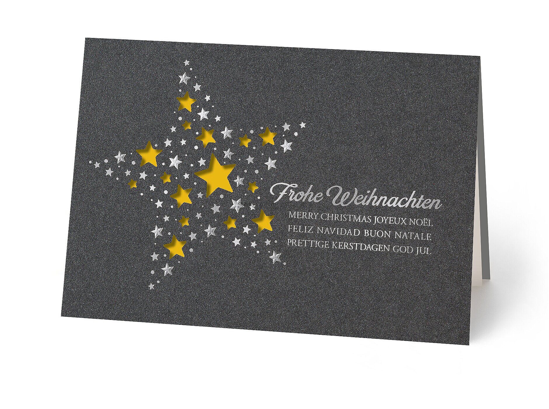 Weihnachtskarte international. Das Anthrazit der Karte wirkt durch das farbig hinterlegte Einlegeblatt und die Silberfolien-Prägung sehr edel.