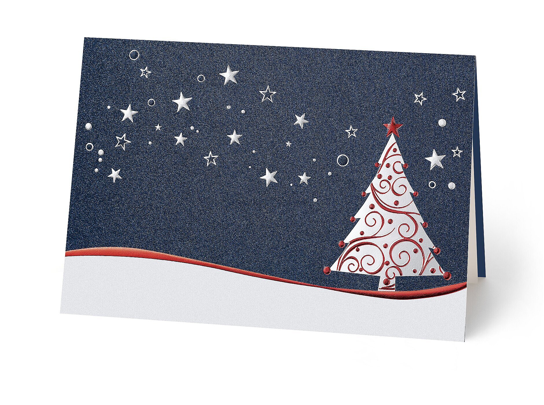 Weihnachtskarte auf dunkelblauem Karton, Baum mit Sternen in hochwertiger Silber- und Rotfolienprägung.