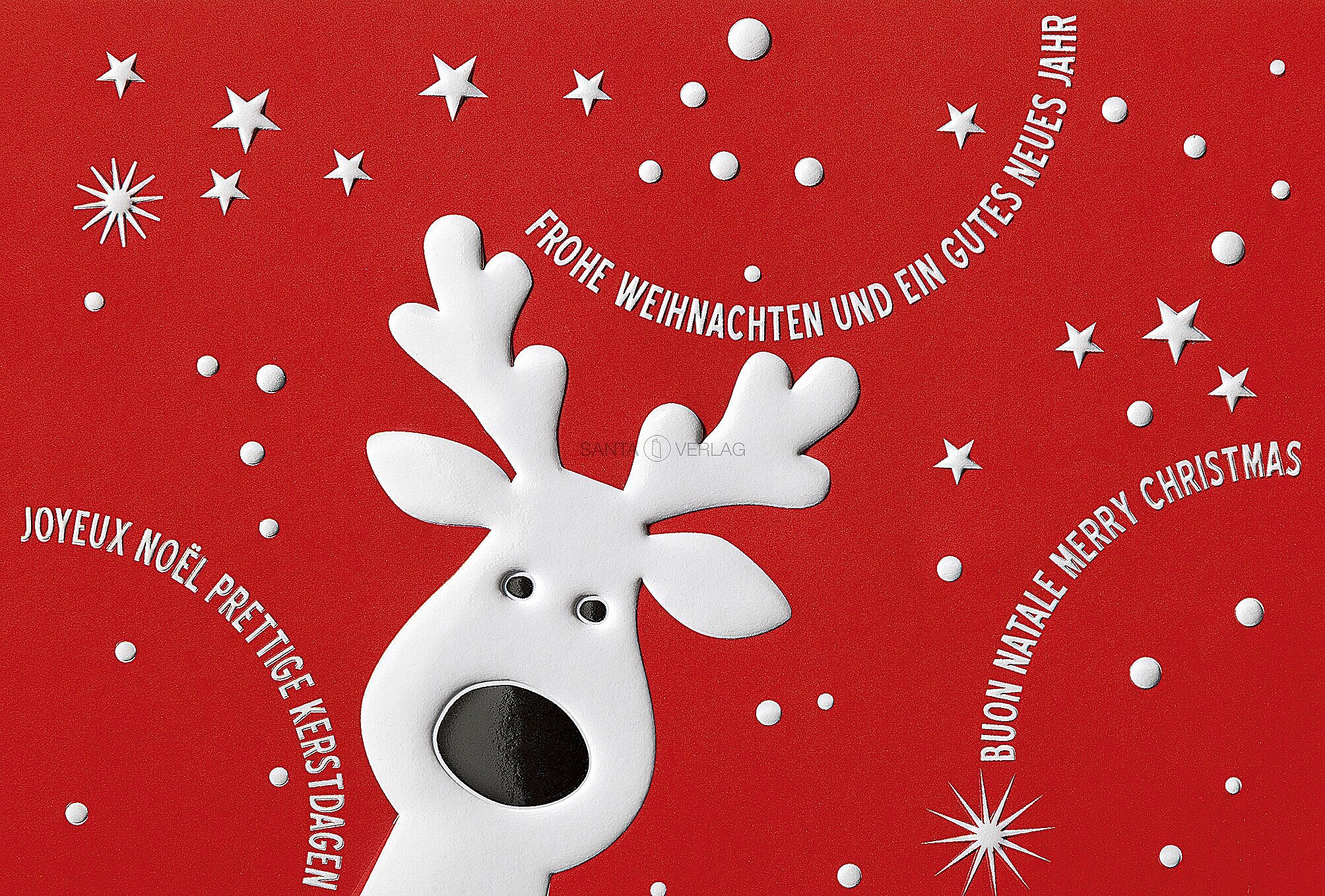 Weihnachtsgrüße international "Lustiger Elch" auf rotem Karton durch Weißfolienprägung veredelt.