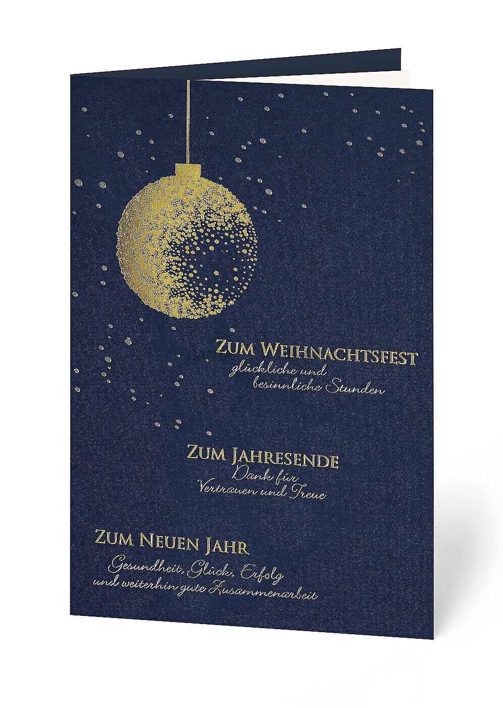 Weihnachtskarte/ Businesskarte mit Geschäftstext, symbolhaft geprägt in ansprechender Gold- und Silberfolie.