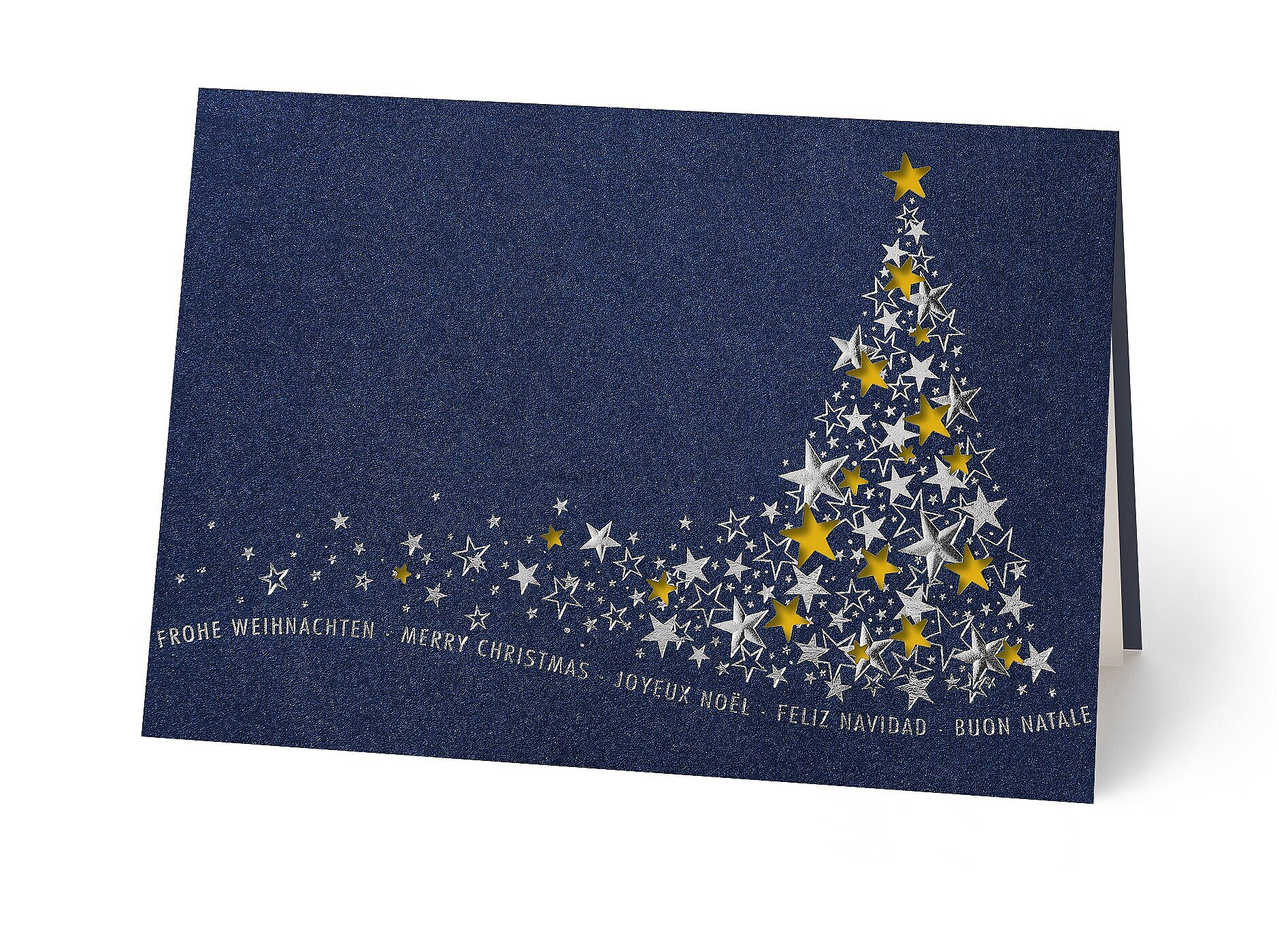 Weihnachtsgrüße international. Die symbolhafte Silberfolienprägung und farbig hinterlegte, effektvolle Laserstanzung bringen diese Karte zum Strahlen.