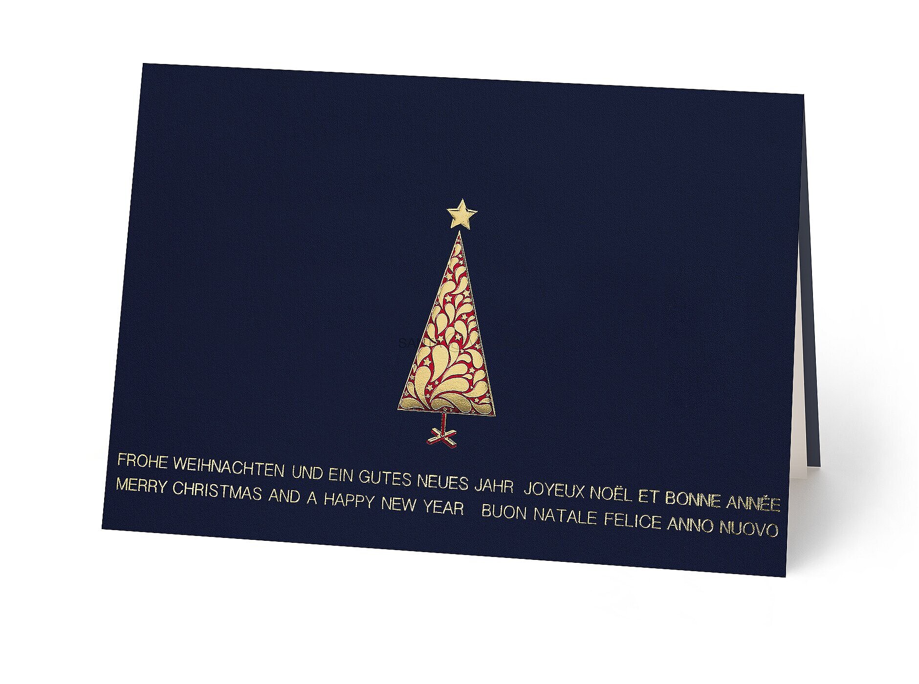 Weihnachtskarte/Neujahrskarte auf dunkelblauem Samtkarton. Reduziertes Design in Rot- und Goldfolienprägung verleiht besondere Eleganz.