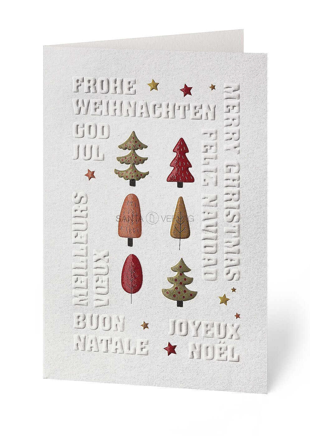 Weihnachtskarte international auf cremefarbenem Premiumkarton. Die anspruchsvolle Blindprägungen, überzogen mit attraktive neuen Spotlackfarben, verleihen diese Karte eine exklusive Haptik.