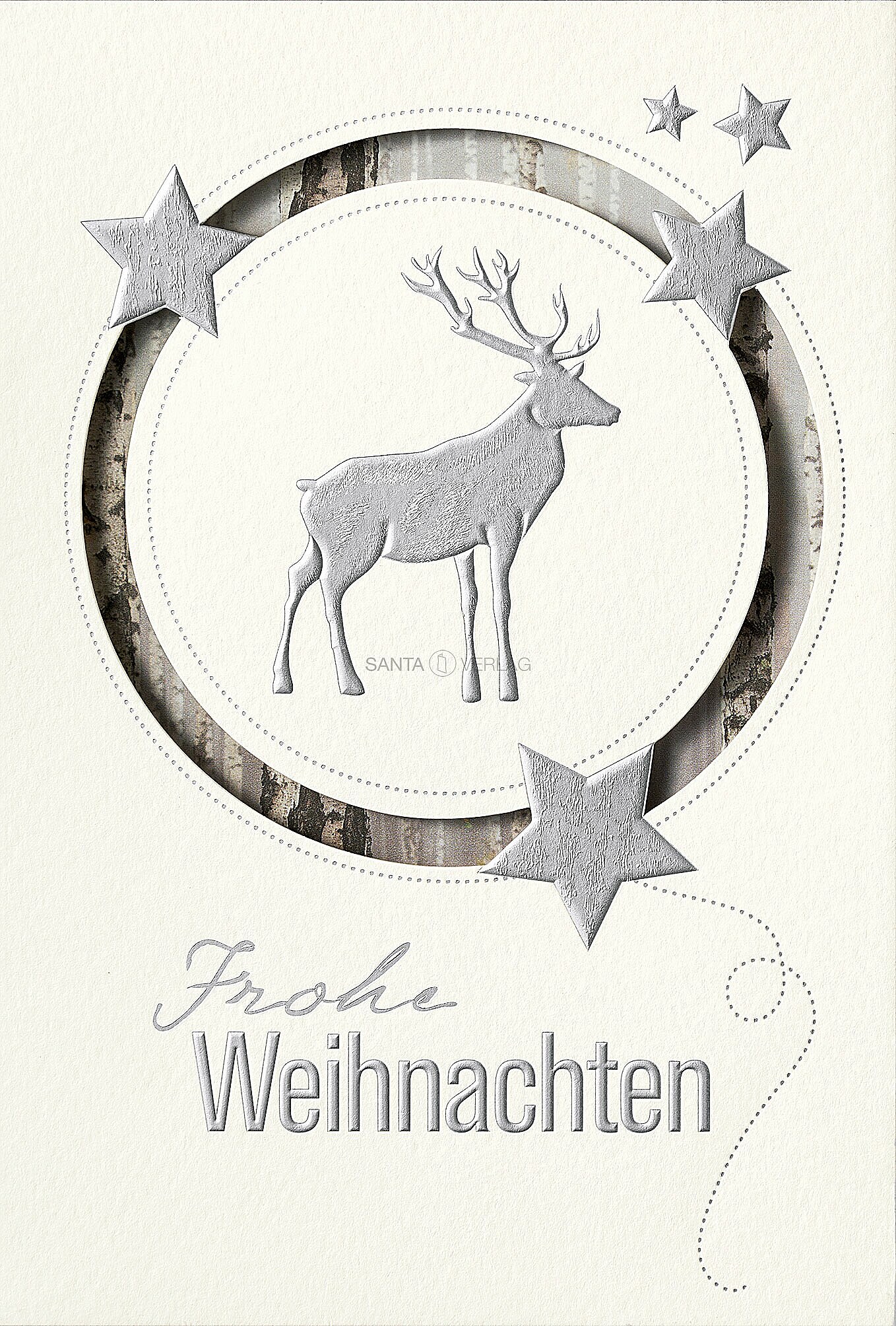 Weihnachtskarten heller Strukturkarton. Die raffinierte Stanzung wird durch eine kräftige Silberfolien-Prägung effektvoll in Szene gesetzt.