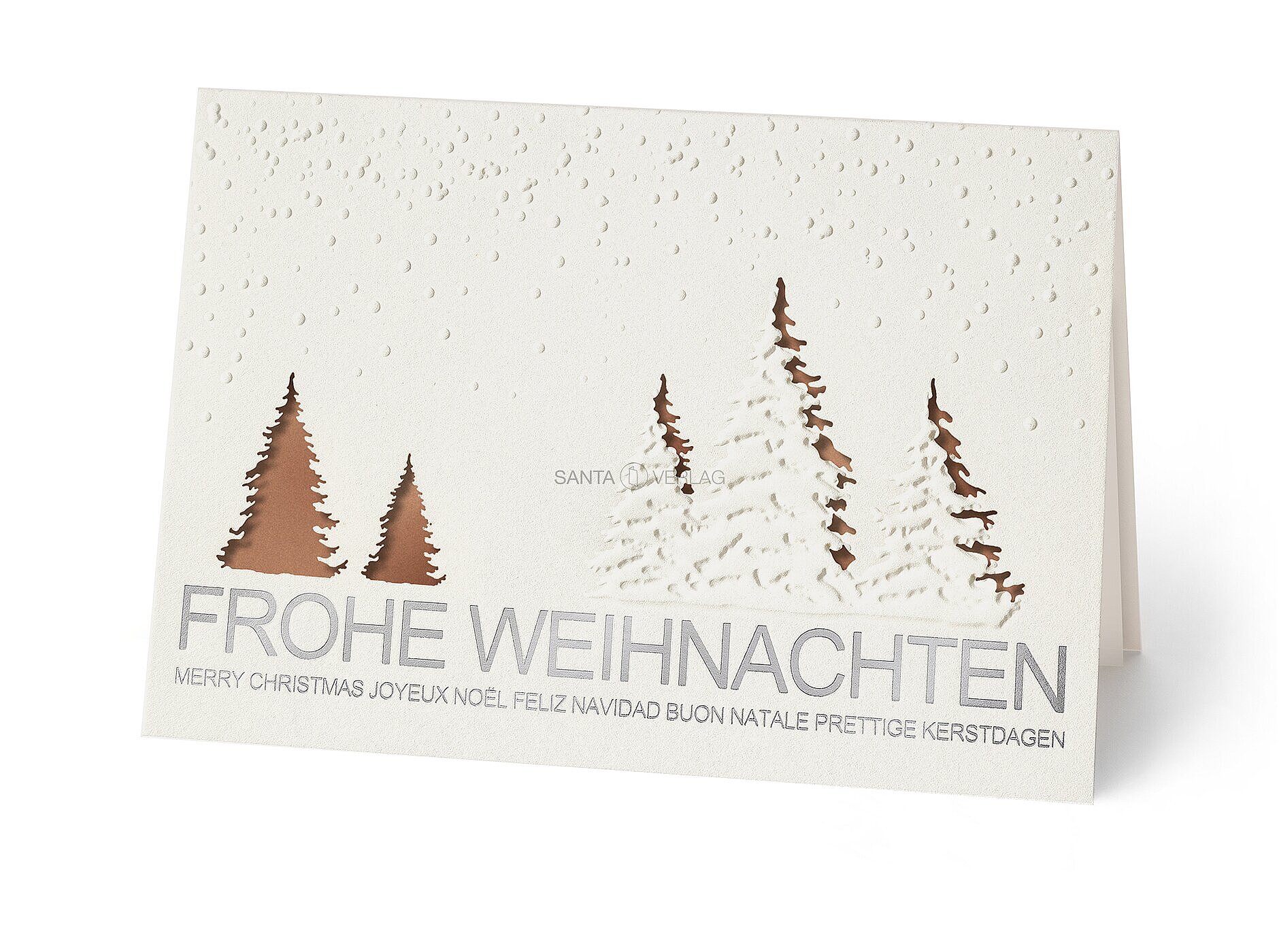 Weihnachtsgrüße international auf Strukturkarton creme. Effektvolle Stanzung bringt das farbig hinterlegte Einlegeblatt stilvoll zur Geltung.