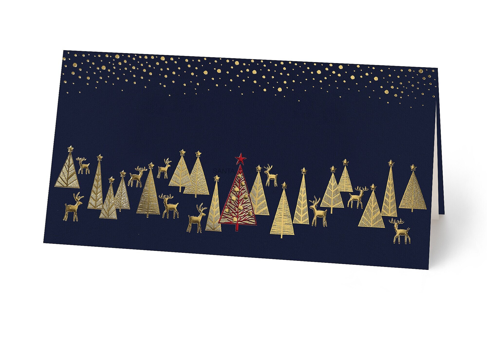 Weihnachtskarten auf dunkelblauem Samtkarton. Sehr edel wirkend durch feine Goldflocken und der symbolhaften Goldfolien-Prägung.