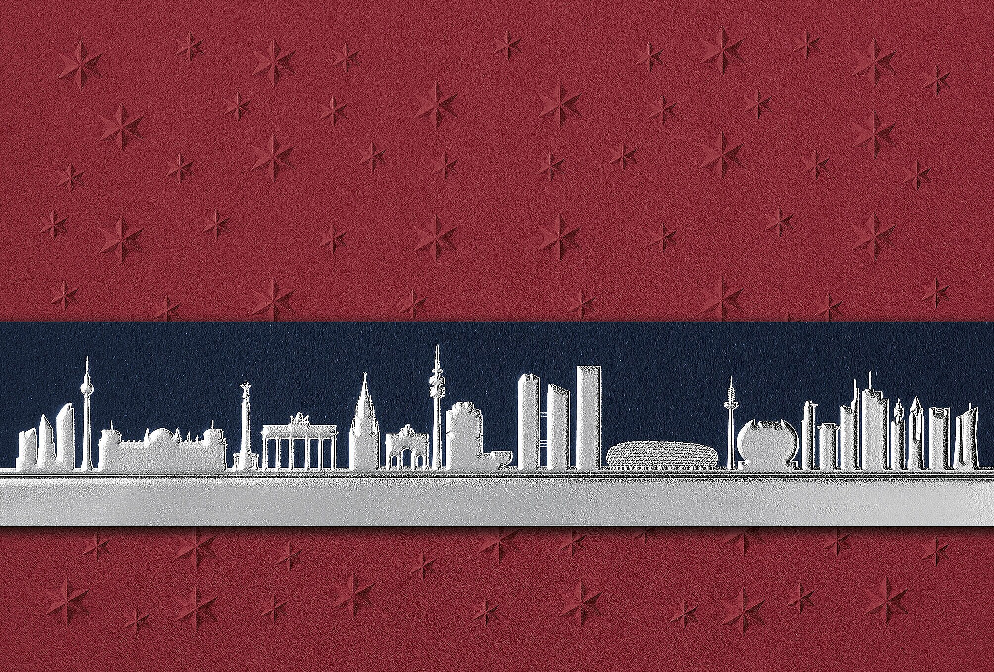 Weihnachtskarten cherry Karton matt, verziert mit einer dunkelblauen Banderole "Skyline" in Silberfolienprägung.