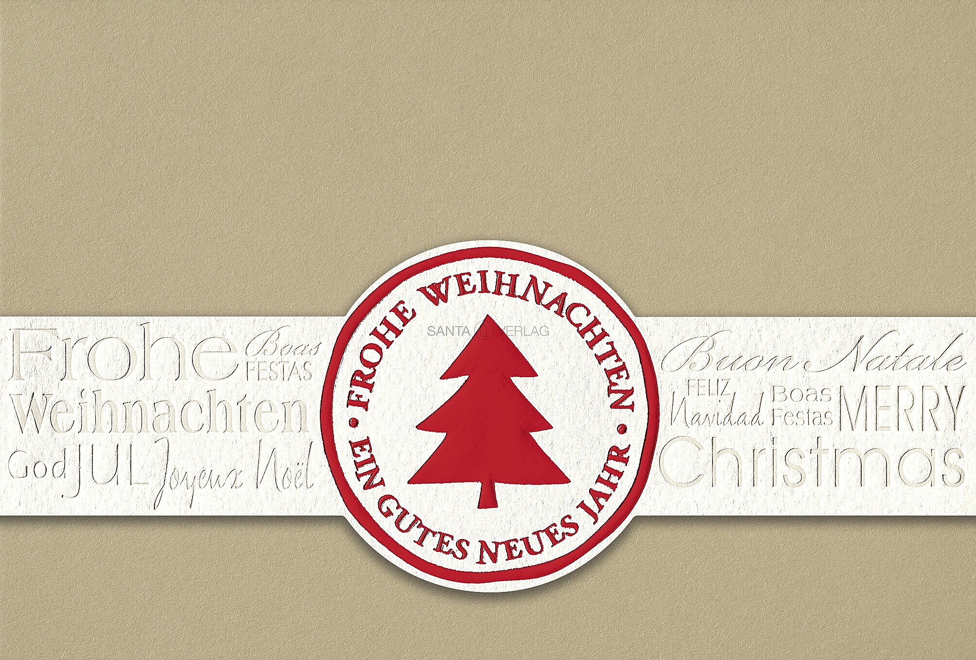 Weihnachtskarten camel Karton matt, verziert mit einer Textbanderole in creme und rotem Siegel .