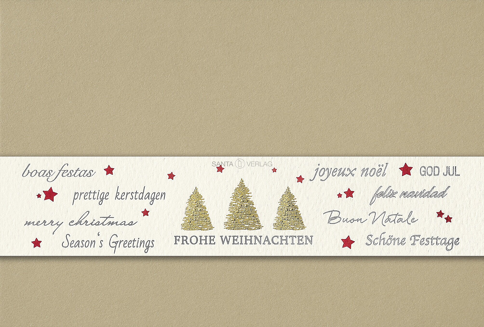 Weihnachtskarten camel Karton matt, verziert mit einer Textbanderole in weiß durch Gold-Silber- u. Rotfolienprägung veredelt.