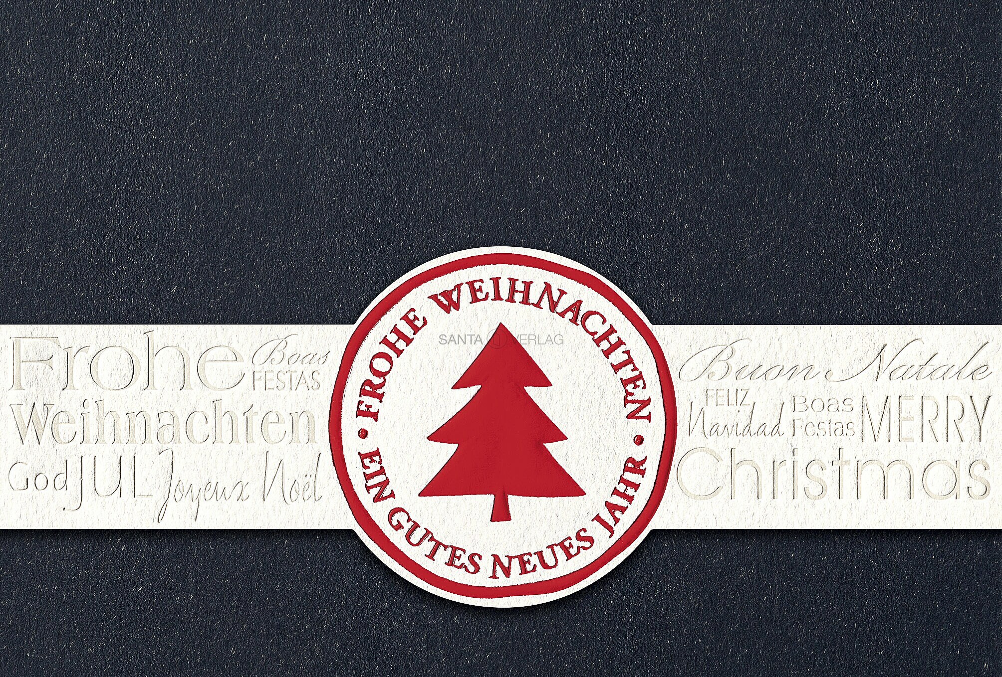 Weihnachtskarten dark blue Karton matt, verziert mit einer Textbanderole in creme und rotem Siegel .