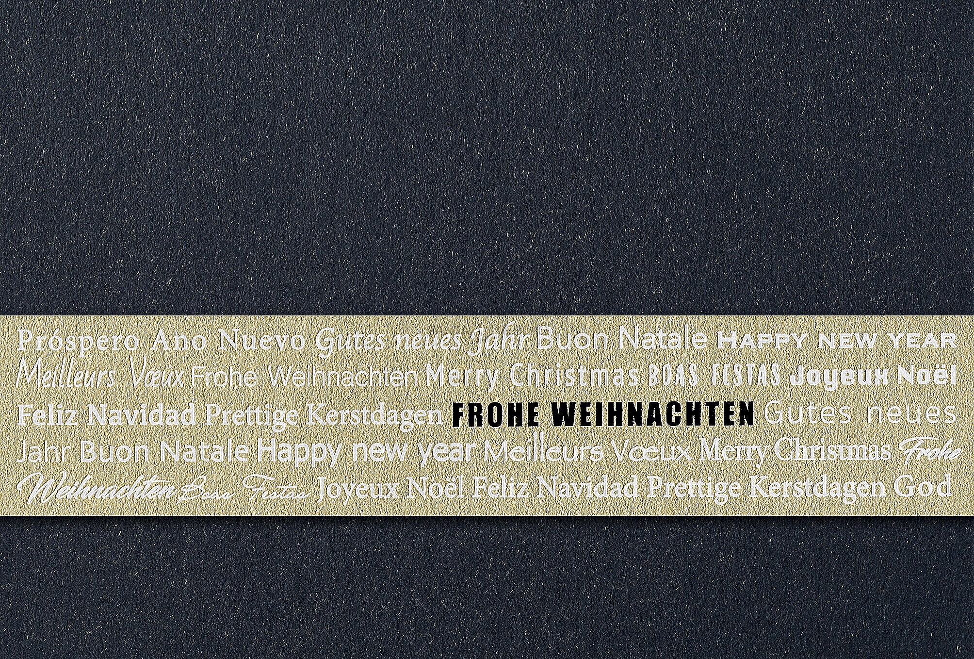 Weihnachtskarten dark blue Karton matt, verziert mit einer Textbanderole goldmetallic durch Silber- und Schwarzfolienprägung veredelt.