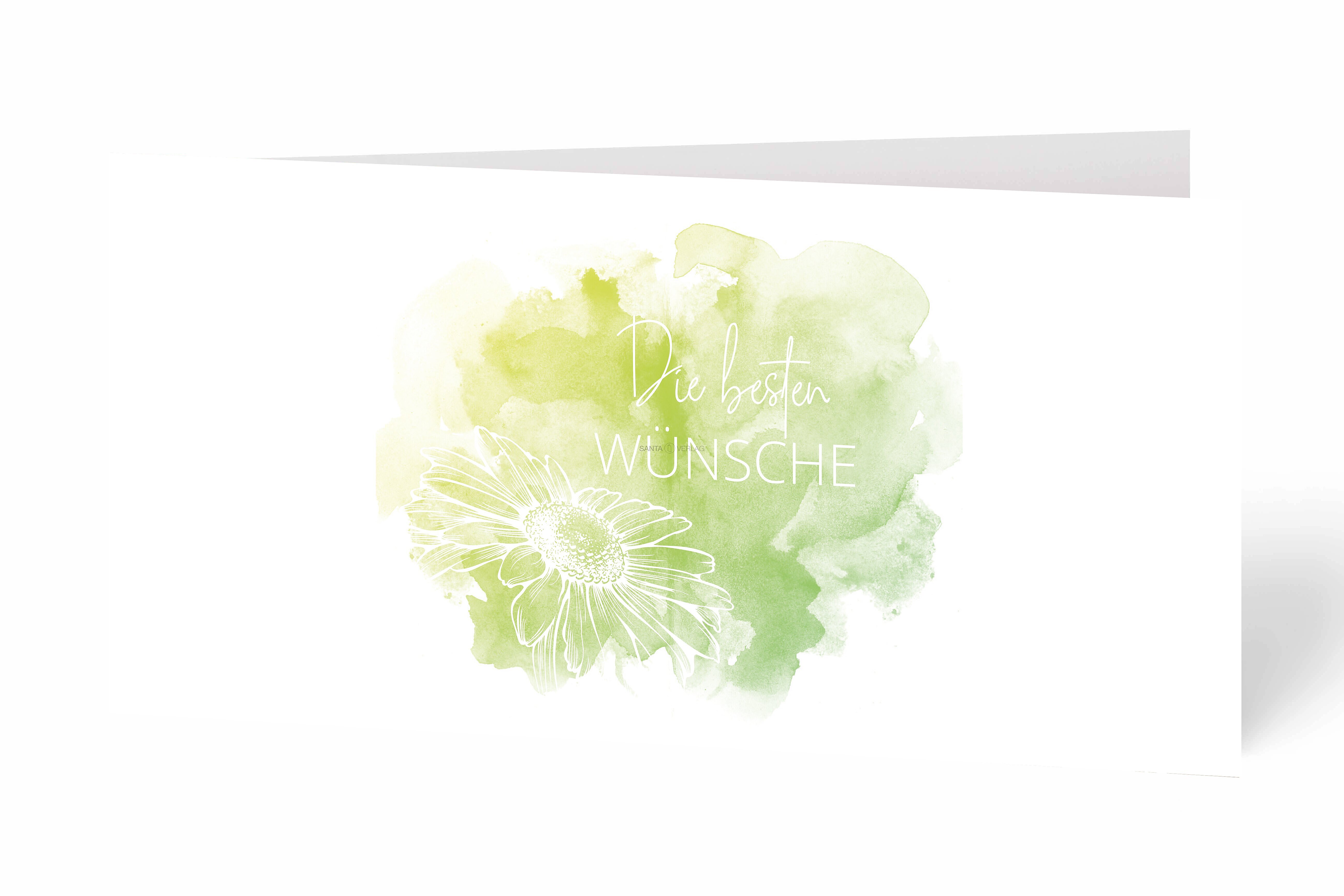 Moderne Glückwunschkarte mit einem gelb-grünen Aquarellklecks und weißer Margerite
