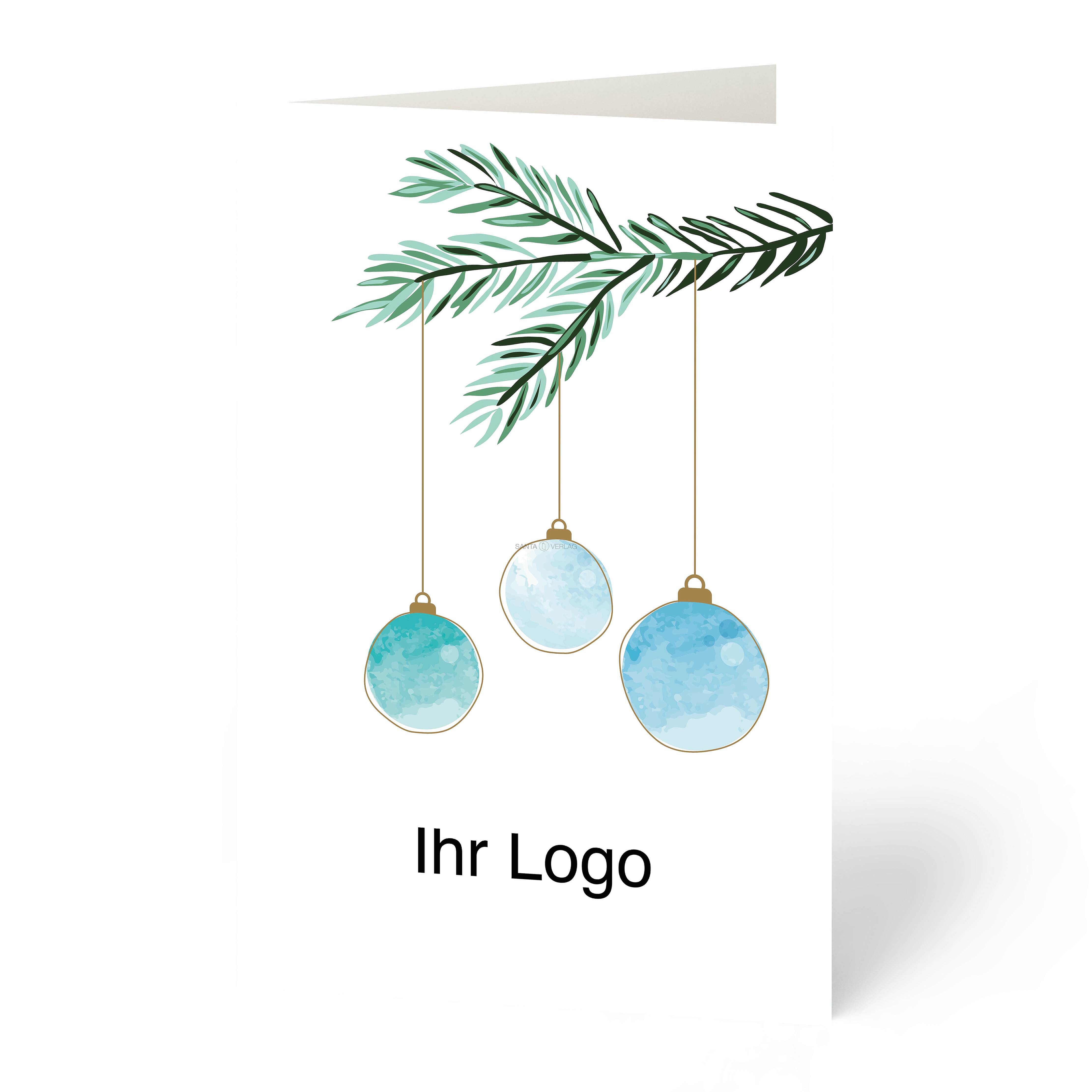 Weihnachtskarte, Weihnachtskarte mit Kugeln und Tannenzweigen mit Platz für Ihr Logo