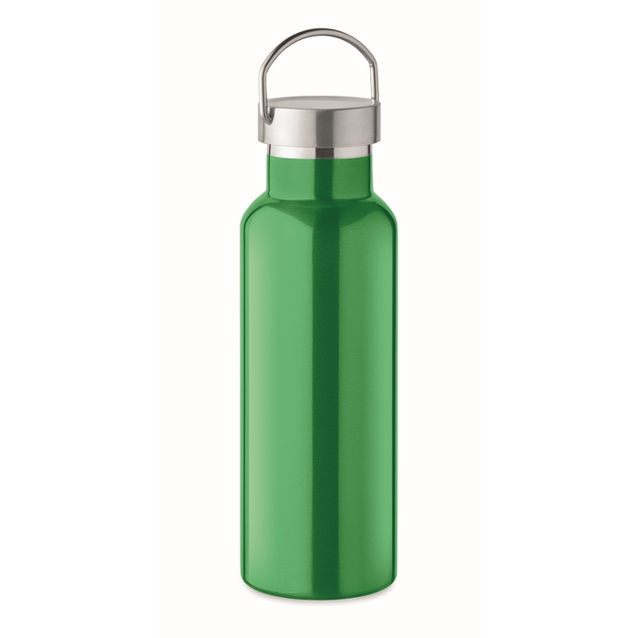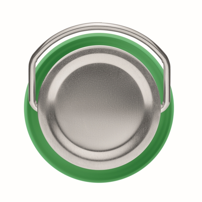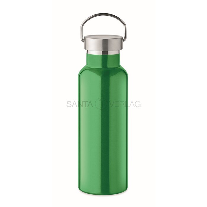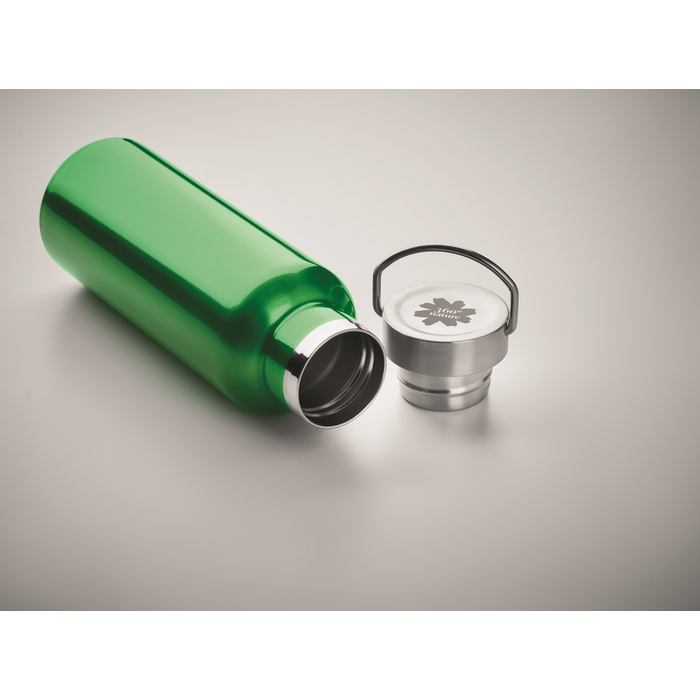 Nachhaltiger Trinkspass mit doppelwandiger Isolierflasche in der Farbe grün aus recyceltem Edelstahl (90 % recycelter Edelstahl und 10 % Edelstahl). Dank ihres Materials bietet die Trinkflasche nicht nur eine nachhaltige Alternative zu Einwegflaschen, sondern reduziert zudem den Bedarf an neuen Rohstoffen. Die spülmaschinenfeste Flasche bietet ein Fassungsvermögen von 500 ml und überzeugt nicht zuletzt mit ihrem stabilen Schraubverschluss mit Henkel. Durch ihre kompakte Größe und das leichte Gewicht ist sie zudem einfach zu tragen und eignet sich ideal als Begleiter für unterwegs - ganz egal ob bei der Arbeit oder in der Freizeit beim Sport.