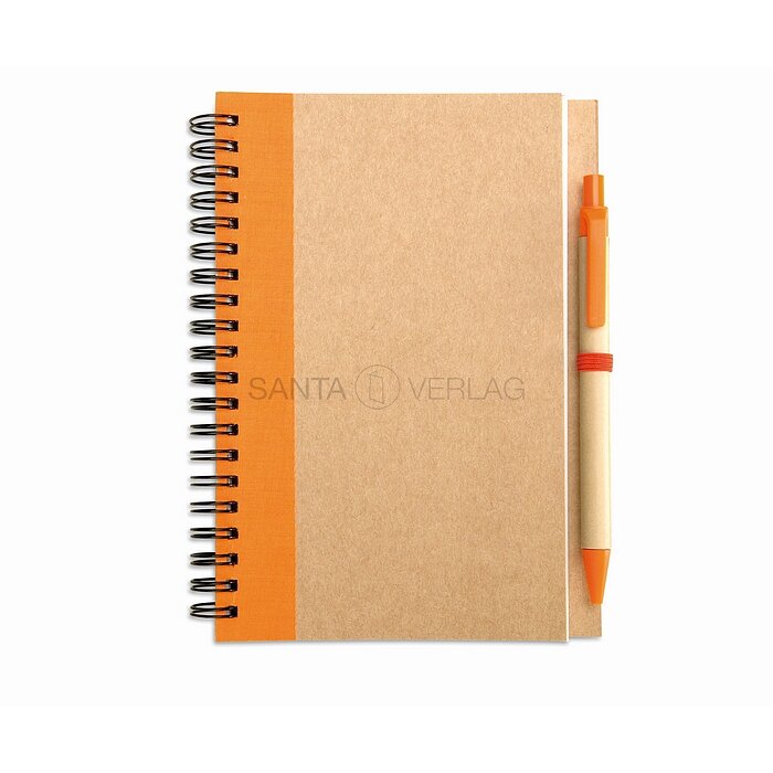 Ringbuch in der Farbe orange mit 70 Blatt (140 Seiten) recyceltem Blankopapier. Spiralbindung. Druckkugelschreiber aus recyceltem Karton mit Clip, Spitze und Drücker aus natürlich abbaubaren Kunststoff. Stiftschlaufe. Blaue Tinte.