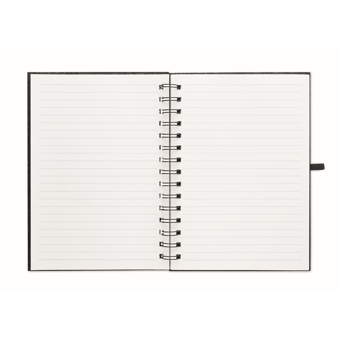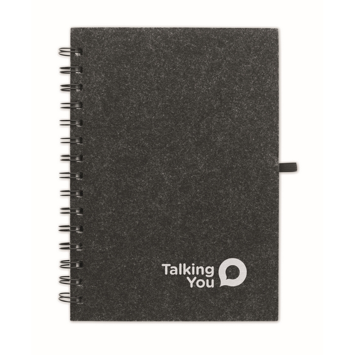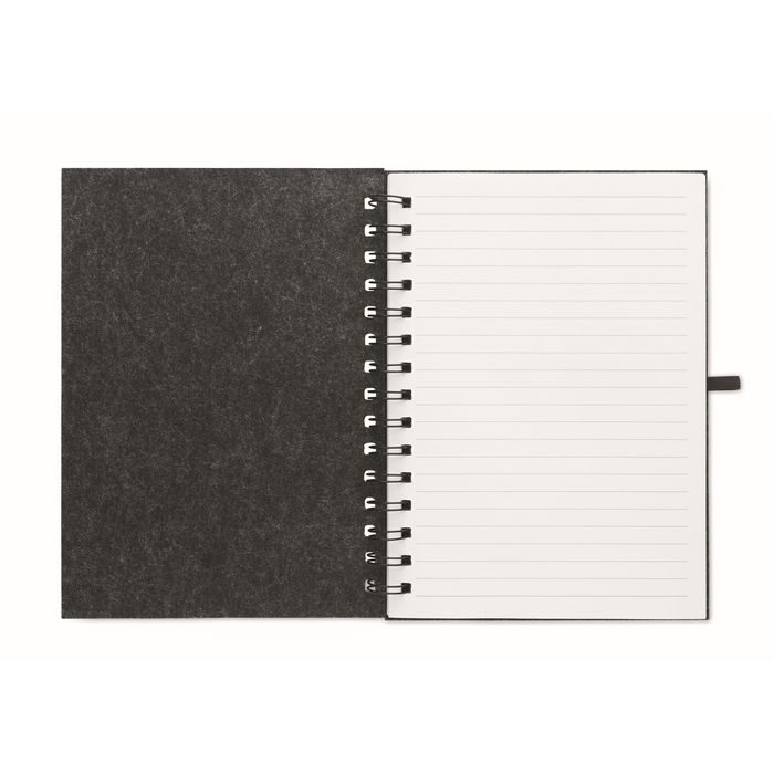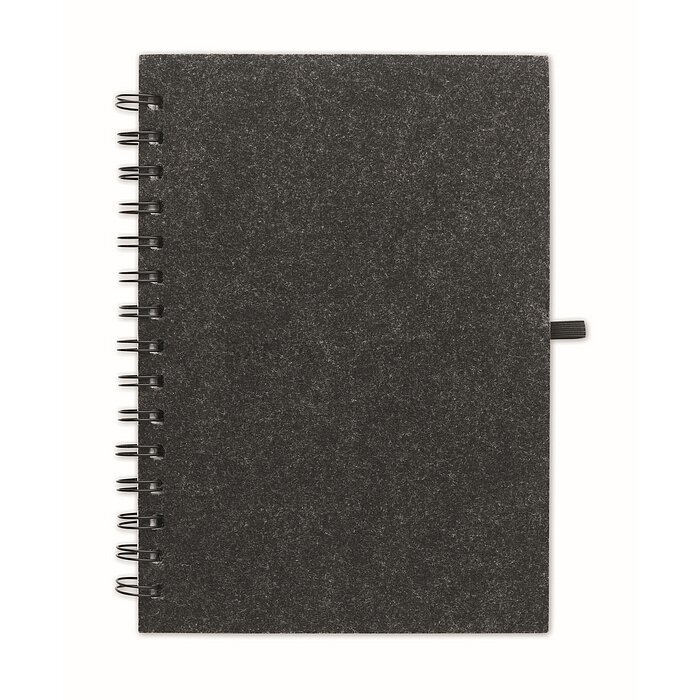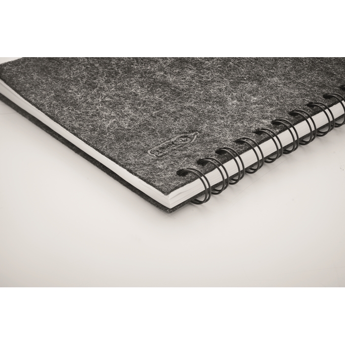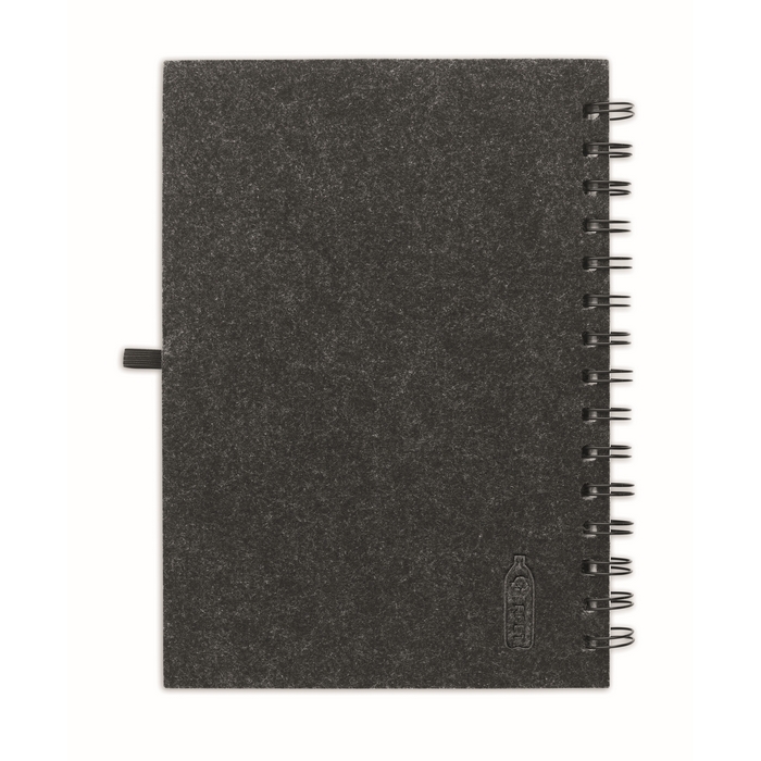 DIN A5 Notizbuch mit RPET-Filz Cover dunkelgrau mit Spiralbindung 80 Blatt (160 Seiten) liniertes Recyclingpapier (70 g/m²). Elastische Stiftschlaufe. rPET oder auch recyceltes Polyethylenterephthalat nennen sich alle Kunststoffe, die aus Rezyklat oder Altplastik bestehen. Sicher ist bereits bekannt, dass recycelte Produkte die nachhaltigere Wahl sind.