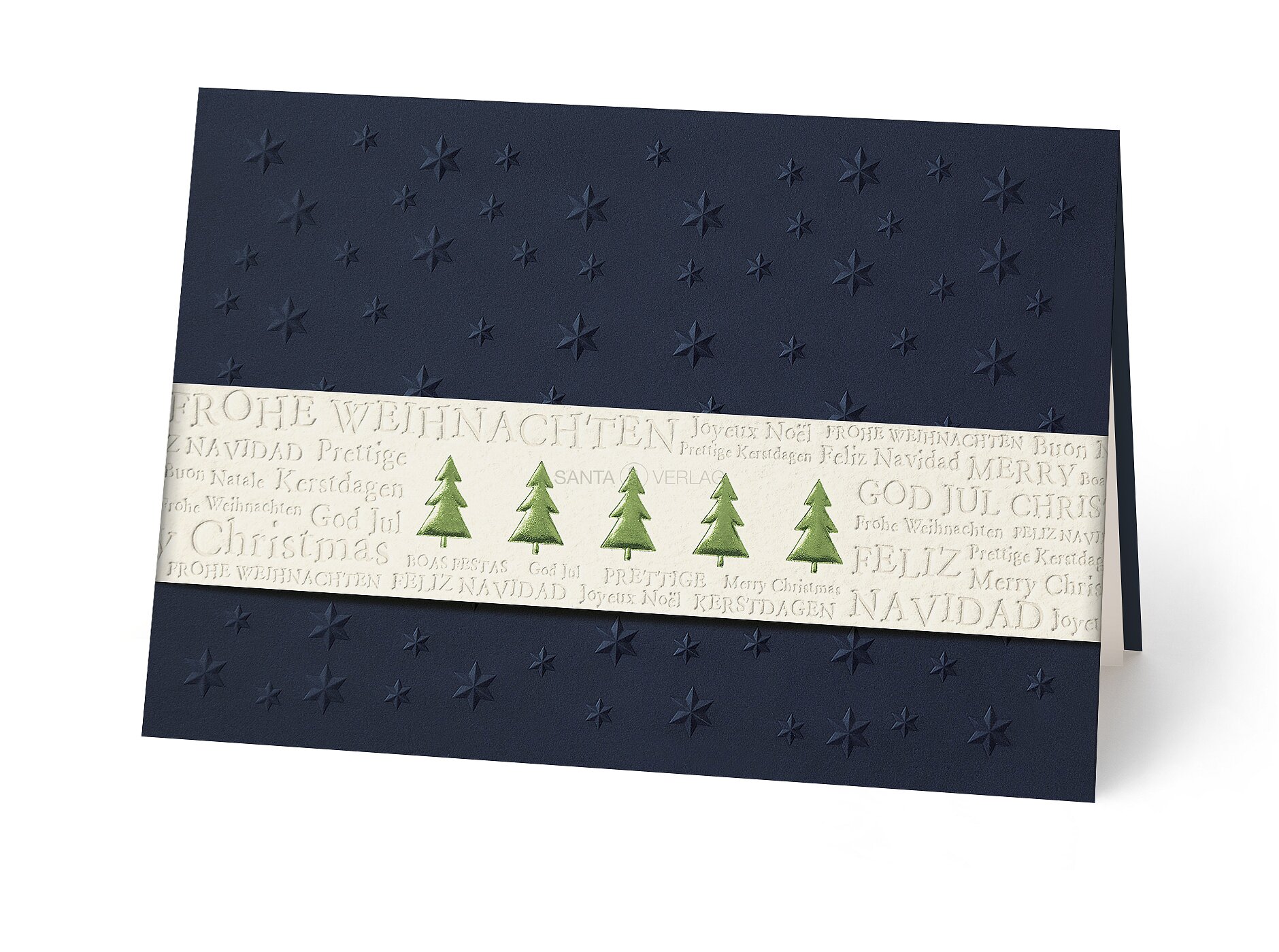 Weihnachtskarten Karton "Sterne" metallic-blau verziert mit einer Banderole in creme "Bäume" sind eine charmante Art Weihnachtsgrüße zu übermitteln.