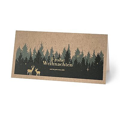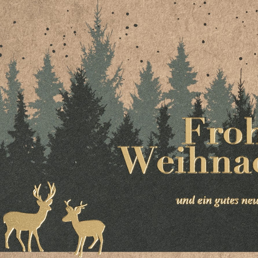 Verzauberter Winterwald in schönen Grüntönen mit edler Goldfolienprägung auf Kraftpackhintergrund.