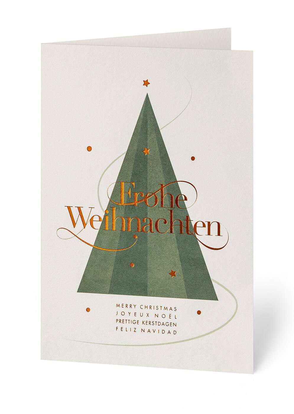 Moderne Weihnachtskarte mit internationalen Wünschen auf weißem Feinstkarton. Die kupferfarbene Prägung verleiht dieser Karte eine edle Haptik und einen glänzenden Effekt.